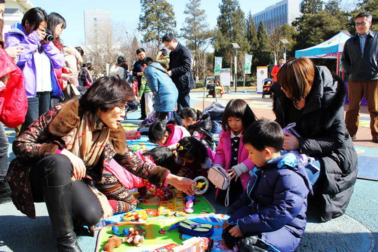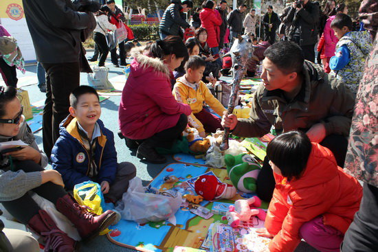 人民网北京3月2日电 3月1日下午,在中国儿童中心文艺宫广场,100多名儿童支起了摊位,相互交换、交易家里的闲置物品,来“逛摊”的小朋友们络绎不绝,场面十分热烈。原来这是由中国儿童中心“小小跳蚤市场”携手中国狮子联会北京希望服务队“童心市集”共同为孩子们打造的一场以旧物交易为中心的儿童快乐大聚会。中国儿童中心主任、中国狮子联会主席等热情地参与活动,来自北京高校的10名大学生志愿者和来自意大利的20名国际狮子会志愿者也到现场参加服务。
