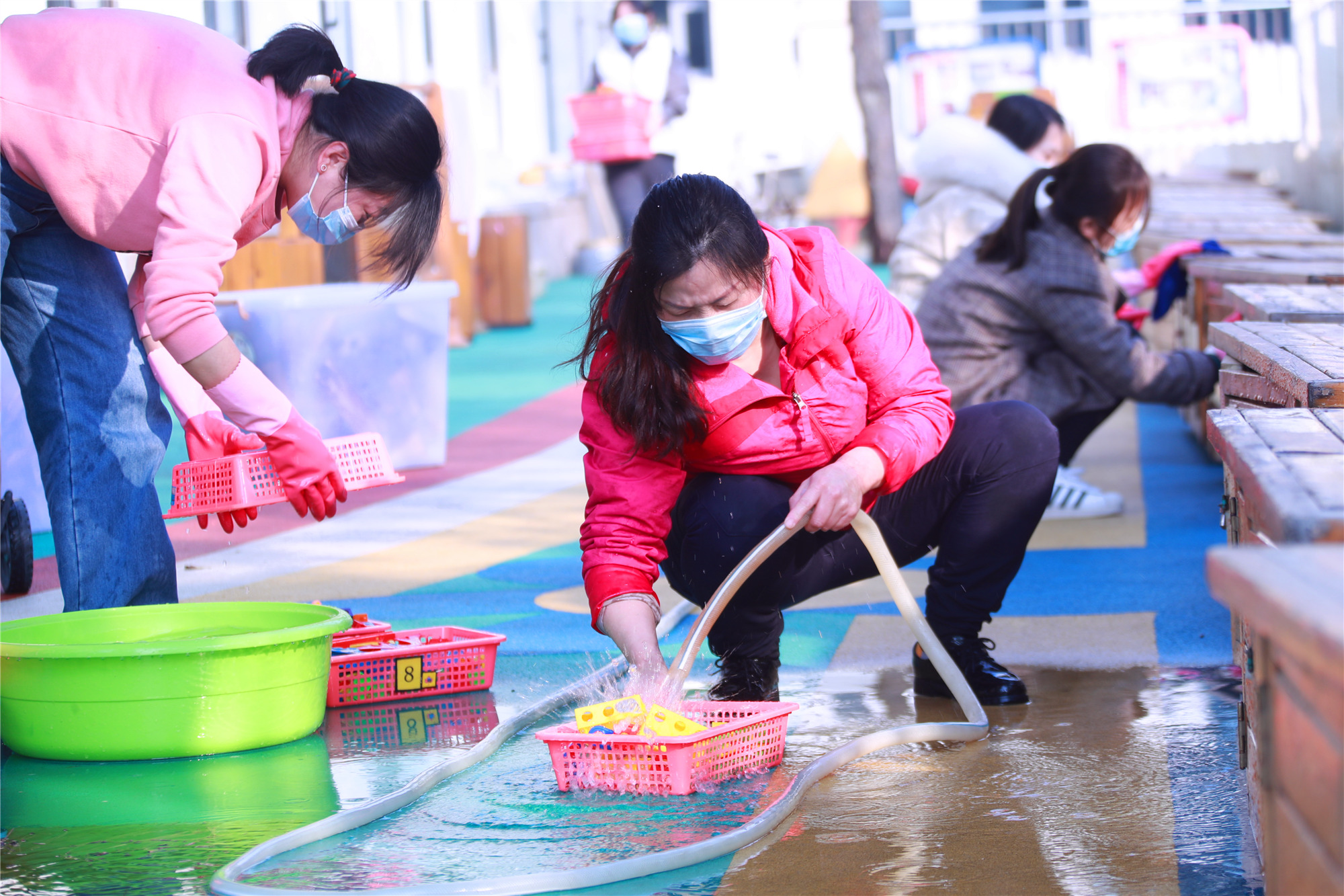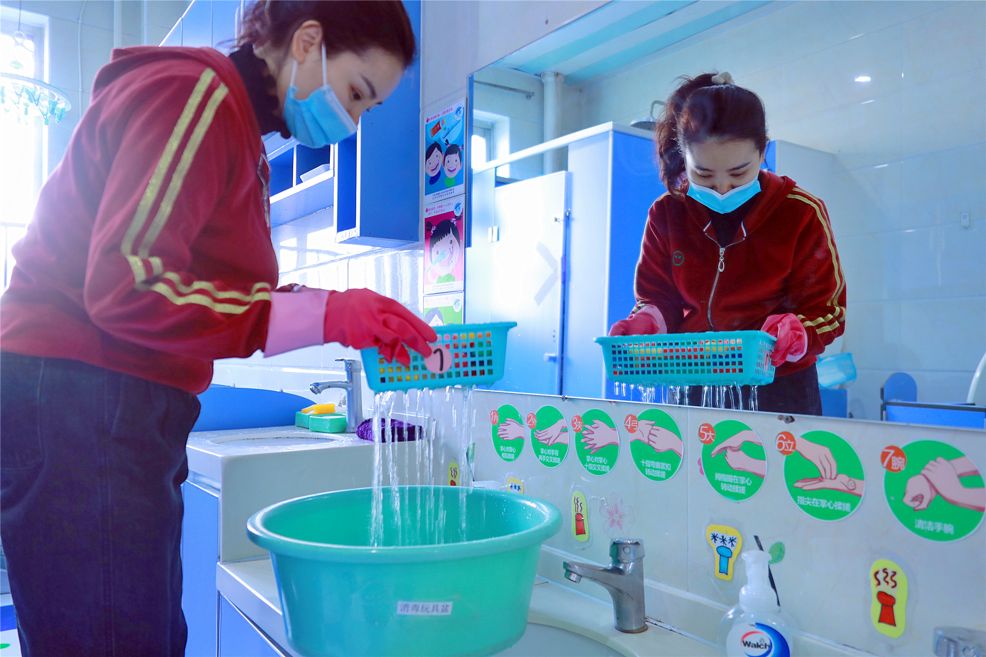 开学前,幼儿园要求老师们在对前后院公共环境、班级环境及玩教具彻底消清消的基础上,还要求班级老师严格执行卫生消毒制度,班级玩教具按要求浸泡或者日光下暴晒消毒,不能清洗或暴晒的玩教具要用紫外线消毒,为孩子们营造身心健康成长的物质环境和生态环境。 结束语 随着中国儿童中心学前教育部老师们认真落实全国妇联的工作部署 ,按教育部“春季学期正常、安全、错峰开学”的总体要求,在中国儿童中心的领导下,在西城区教委的指导下,老师们将常态化防控压实责任、做好教学准备、强化物资储备和应急演练、开展防疫健康教育、加强园内外日常工作管理等层层落实,确保了师幼的健康安全,部门的教育教学工作将更加安全有序。一个良好的开端将托起我们工作更上层楼的希望,我们相信,今后,大家的脚步将更加坚定有力,奋进新时代,我们精气神十足。 |