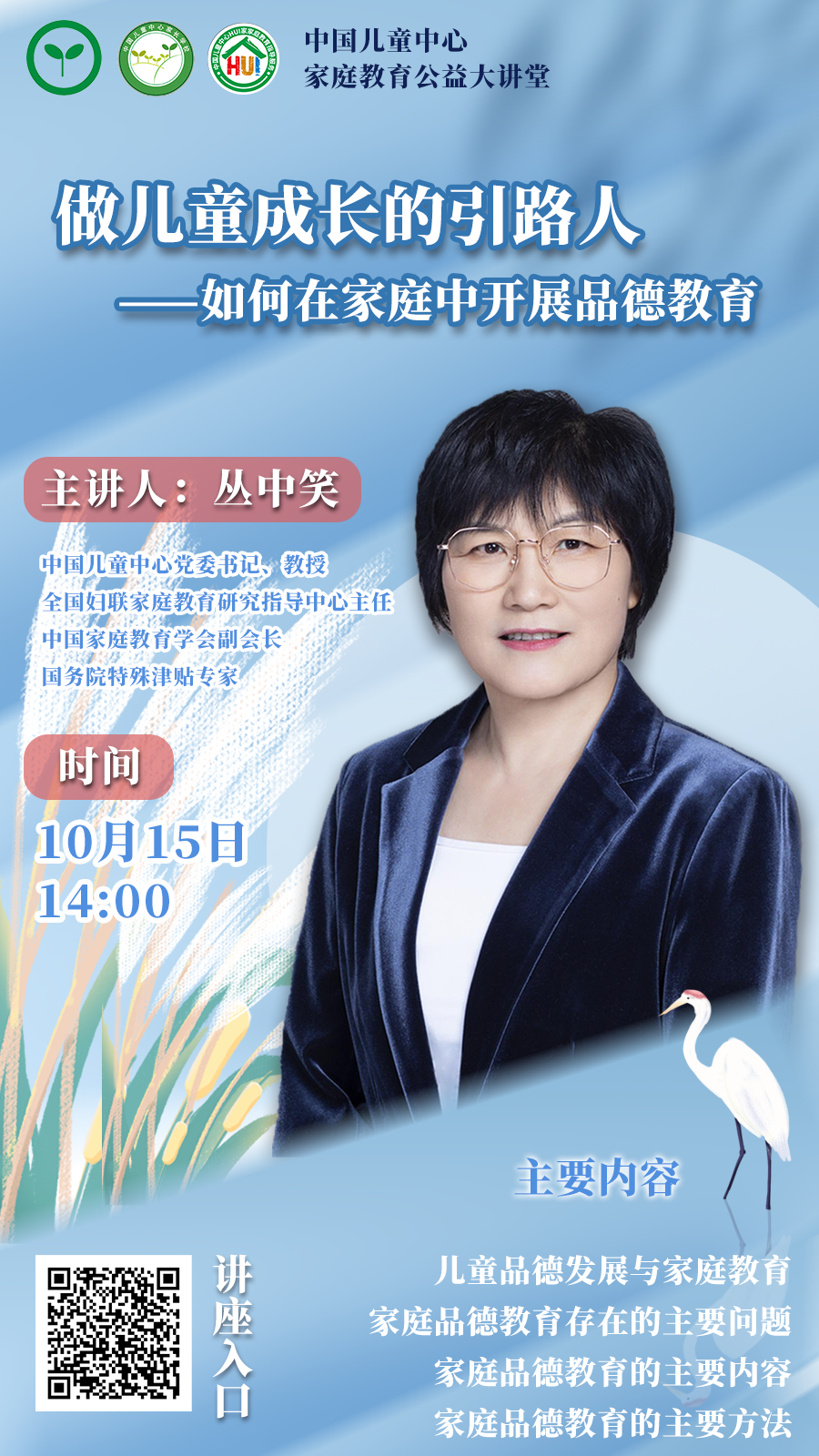 为了贯彻习近平总书记致中国儿童中心成立40周年贺信精神,继续发扬光荣传统,坚守为党育人、为国育才初心使命,落实立德树人根本任务,做儿童的引路人、守护人、筑梦人,以实际行动迎接党的二十大胜利召开,中国儿童中心家长学校将持续推出讲座、沙龙、咨询、征文等活动。 家庭是立德树人的第一所学校。如何发挥家庭教育的独特优势,才能在家庭中培育儿童的好品德? 本周讲座的主题是“做儿童成长的引路人——如何在家庭中开展品德教育”,我们将从儿童的品德发展特征开始,为您系统解答家庭德育的主要问题、主要内容和主要方法。 主讲专家是中国儿童中心党委书记、全国妇联家庭教育研究指导中心主任、中国家庭教育学会副会长丛中笑教授。 10月15日(本周六)下午2点,中国儿童中心映目平台准时为您直播,扫描海报中的二维码即可进入直播间。 |