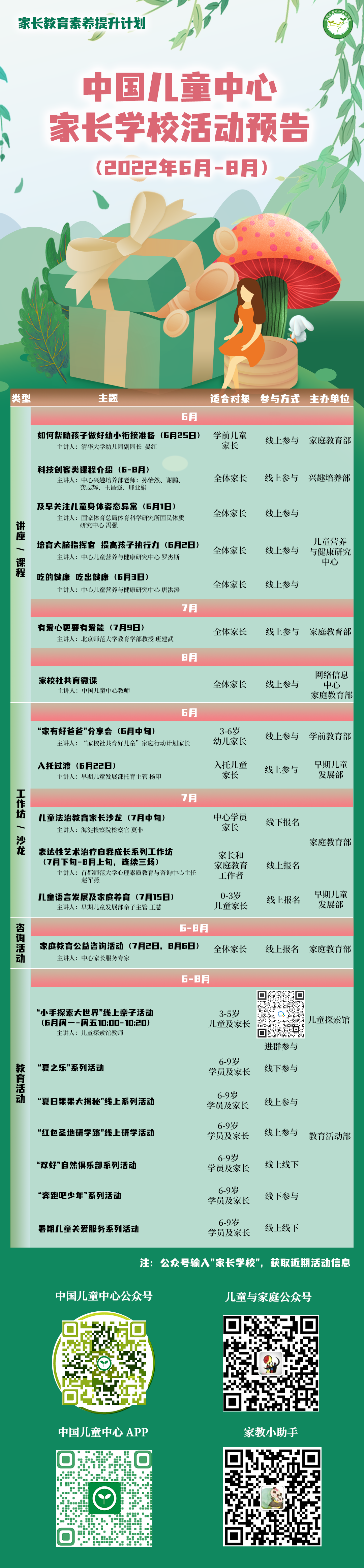 中国儿童中心家长学校活动预告(2022年6-8月)