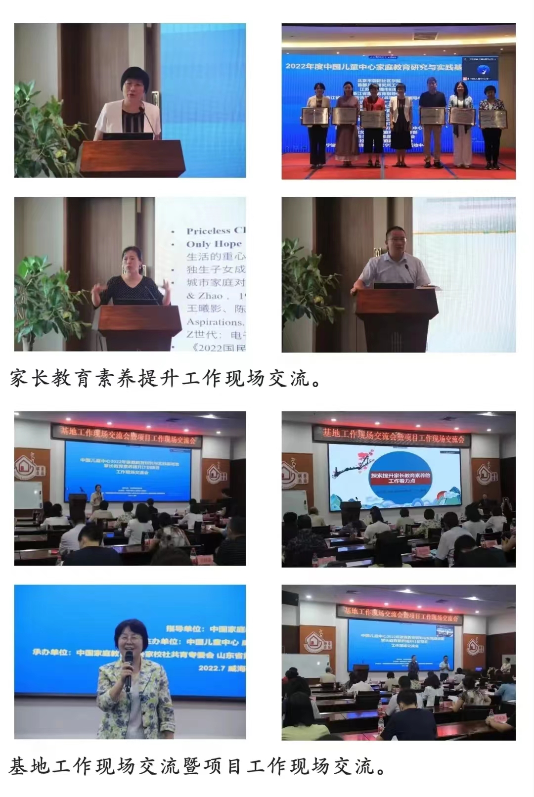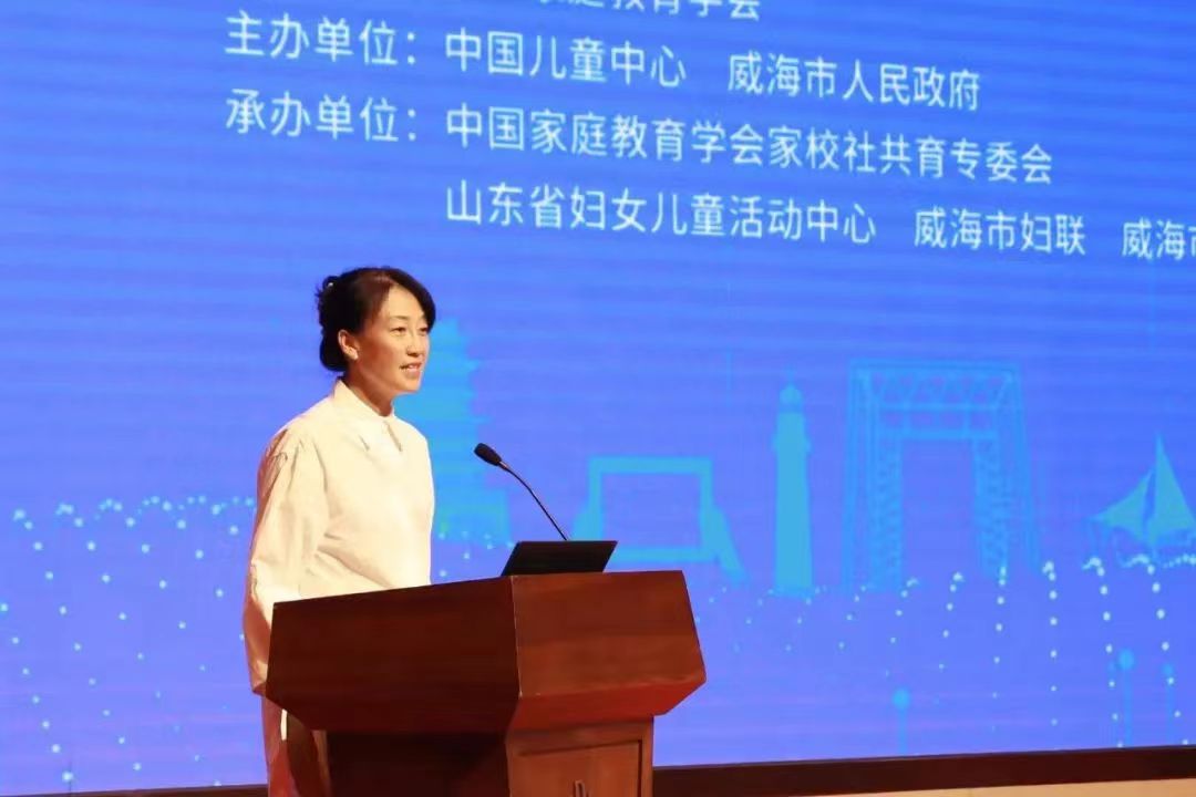 为贯彻落实习近平关于注重家庭家教家风建设论述精神与致中国儿童中心成立40周年贺信精神,深入推进覆盖城乡的家庭教育指导服务体系专业化建设,融合多方力量共同推动家校社协同育人,用心用情促进儿童健康成长、全面发展,7月19日-7月21日,“法治护航家庭教育 共促儿童全面发展”全国贯彻落实家庭教育促进法暨家长教育素养提升工作现场交流会在山东省威海市成功举办。 本次活动由中国家庭教育学会指导,中国儿童中心、威海市人民政府主办,中国家庭教育学会家校社共育专委会、山东省妇女儿童活动中心、威海市妇联、威海市教育局承办。活动邀请了来自全国各地的8位知名家庭教育专家学者,通过主题交流、现场观摩等方式,围绕贯彻落实家庭教育促进法和开展家长教育素养提升工作进行交流。