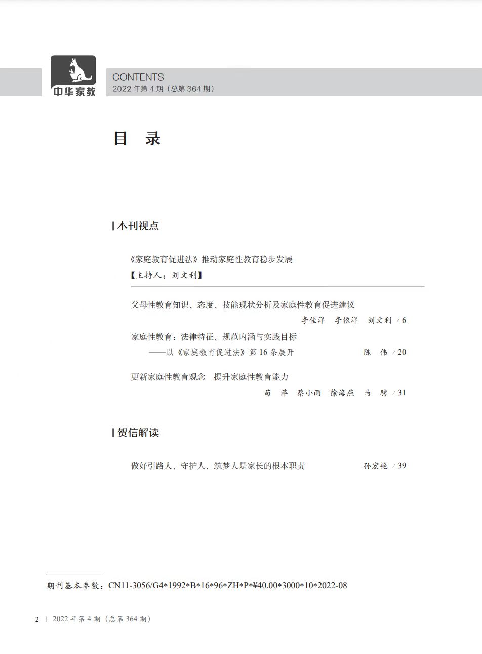 本期文章精彩导读 【本刊视点】 《家庭教育促进法》推动家庭性教育稳步发展 主持人:刘文利 北京师范大学中国基础教育质量监测协同创新中心教授 家庭性教育对促进儿童健康发展、家庭幸福和谐具有重要意义。2022年1月1日起施行的《中华人民共和国家庭教育促进法》(以下简称《家庭教育促进法》)规定:“关注未成年人心理健康,教导其珍爱生命,对其进行交通出行、健康上网和防欺凌、防溺水、防诈骗、防拐卖、防性侵等方面的安全知识教育,帮助其掌握安全知识和技能,增强其自我保护的意识和能力。”2021年9月8日,国务院印发《中国儿童发展纲要(2021—2030年)》,详细要求:“将性教育纳入基础教育体系和质量监测体系,增强教育效果。引导父母或其他监护人根据儿童年龄阶段和发展特点开展性教育,加强防范性侵害教育,提高儿童自我保护意识和能力。”国家出台的一系列法律规范和相关文件,为开展家庭性教育提供了强有力的制度和政策支持!