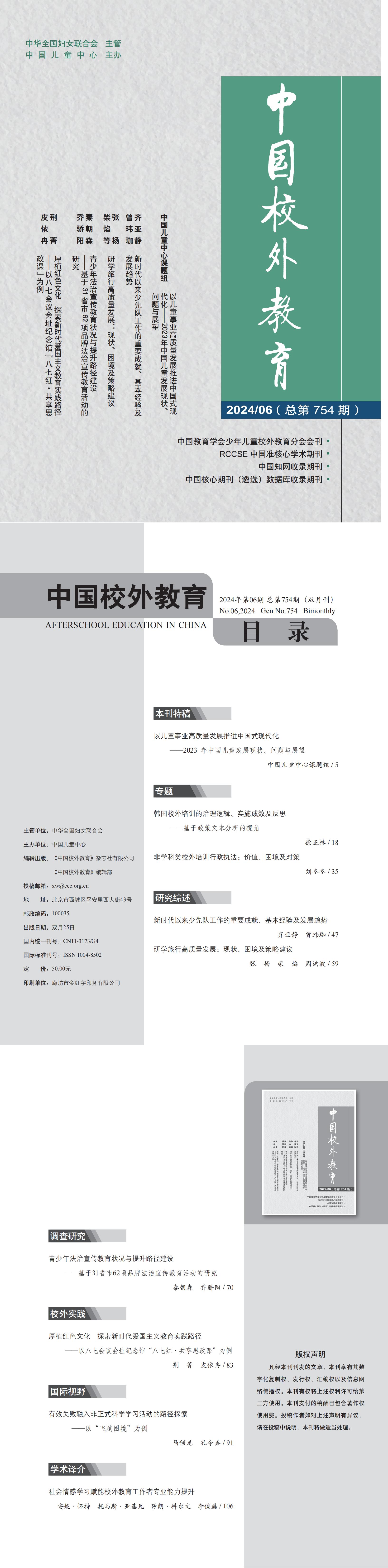 ·特稿 以儿童事业高质量发展推进中国式现代化 中国儿童中心课题组 摘要:2023 年是全面贯彻落实党的二十大精神的开局之年,儿童事业各方面发展取得新突破:儿童健康法规政策体系进一步健全,教育强国建设基点不断夯实,积极推进儿童福利机构高质量发展,创新推进家庭家教家风建设,逐步优化儿童成长环境,未成年人网络保护开启法治新篇章。但是与家庭和儿童日益增长的美好生活需要相比,仍然存在一些亟待关注和解决的问题。2024 年是全面贯彻落实党的二十大精神的关键之年,要深刻领会习近平总书记关于儿童工作的重要指示、重要论述,着力解决儿童身心健康突出问题,深化基础教育提质扩优,推进儿童福利机构优化提质和创新转型,构建家庭教育指导服务体系,为儿童成长创设更加友好的环境,完善未成年人法律保护体系,不断开创儿童事业新局面。 关键词:儿童健康;儿童教育;儿童福利;家庭教育;法律保护 作者简介: 中国儿童中心课题组组长:苑立新,中国儿童中心党委副书记、主任。 主要执笔人:王萍、朱晓宇、王建、宋逸、闫晓英、苑宁宁、邱天敏。课题组成员: 朱晓宇,中国儿童中心科研部部长,研究员; 王萍,中国儿童中心科研部副研究员; 邱天敏,中国儿童中心科研部助理研究员; 王润洁,中国儿童中心科研部副研究员; 肖凤秋,中国儿童中心科研部副研究员; 霍亮,中国儿童中心科研部助理研究员; 张欣蕾,中国儿童中心科研部研究实习员; 魏一,中国儿童中心科研部研究实习员 ·专题 韩国校外培训的治理逻辑、实施成效及反思 ——基于政策文本分析的视角 徐正林 摘要:近二十年来,韩国校外培训治理以解决阶段性问题为导向,以降低韩国学生校外培训参与率、减少学生应试化训练、提升其综合素质、减轻韩国家庭校外培训经济支出负担为目标,秉持关联性、系统性和针对性的理念。治理举措包括:持续提高公办学校教育质量,将优质校外培训内容引入公办学校,选树“无学生参加校外培训”典型学校案例,完善课后学校服务及 EBS 项目,减轻学生升学考试压力,规范校外培训机构管理等。在遵循政治规律、经济规律和教育规律的原则下,体现出“治标与治本结合、校内与校外联动、线上与线下协同”的特征。通过仔细理析近二十年韩国四届政府的校外培训治理政策及其成效,发现总体治理效果不彰。主要原因是韩国宪法赋予校外培训存在合法性后,教育过度市场化,国内外资本与韩国校外培训行业进行了紧密结合;更深层次原因则是学历主义及名校崇拜,社会阶层固化后年轻人阶层跃升机会减少,以及学习竞争过度化等。 关键词:韩国;校外培训;治理逻辑;阶层固化 作者简介:徐正林,丽水学院教师教育学院讲师,硕士生导师。 非学科类校外培训行政执法:价值、困境及对策 刘冬冬 摘要:“双减”政策出台后,非学科类校外培训机构数量增长加速,但办学乱象凸显,需要政府依法治理。实施行政执法是治理乱象的有效手段,不仅可以完善相关领域法治建设,还可以遏制校外培训机构违规办学,保护消费者权益。经与监管部门座谈发现,当前非学科类校外培训行政执法面临执法依据针对性不强、执法主体指向不清晰、执法队伍建设不完善等困境。建议通过建立健全行政法律法规,强化执法依据;各级政府完善法规政策,明确执法主体;全面加强执法队伍建设,推动执法落实。以期推动非学科类校外培训高效发展,促使校外培训机构规范发展。 关键词:“双减”政策;校外培训;非学科类培训;行政执法;教育治理 作者简介:刘冬冬,天津市教育科学研究院助理研究员。 ·研究综述 新时代以来少先队工作的重要成就、基本经验及发展趋势 齐亚静 曾玮珈 摘要:新时代以来,以习近平同志为核心的党中央高度重视少年儿童和少先队工作,站在党和国家后继有人的战略高度,加强对少先队工作的领导,推动少先队工作取得重要成就。少先队工作理论实现创新发展,少先队教育作用和政治引领功能更加凸显,少先队组织建设取得新发展,网上少先队工作成效突出,少先队工作者队伍建设持续增强,少先队工作的体制机制更加完善。新时代少先队工作积累了宝贵经验,如坚持党的领导、坚持为党育人、坚持儿童为本、坚持全团带队、深化团教协作、优化制度保障、坚持改革创新等。新时代新征程,未来少先队工作应呈现更加突出儿童性、广泛性、专业性、现代化、社会化、制度化的发展趋势。 关键词:新时代;少先队工作;少年儿童;重要成就 作者简介: 齐亚静,中国青年政治学院青少年工作系副教授; 曾玮珈,中国青年政治学院青少年工作系硕士研究生。 研学旅行高质量发展:现状、困境及策略建议 张杨 柴焰 周洪波 摘要:研学旅行对教育理念的传承创新、青少年综合素质的提升,以及文化和旅游的融合发展具有重要意义。在国家和省(市)级研学旅行相关政策的持续催化以及行业监管下,供给主体不断推动市场发展,然而,研学旅行的参与率和普及率依然偏低。现阶段,我国研学旅行存在安全保障缺乏、课程质量不高、专业力量薄弱、普惠性不足等问题。基于此,本文建议从安全性、课程、供给主体、社会支持等方面着手,共建安全防控机制、构建课程体系、提升专业水平、拓宽多元经费,努力实现研学旅行高质量发展。 关键词:研学旅行;研学课程;研学经费;基地/营地 作者