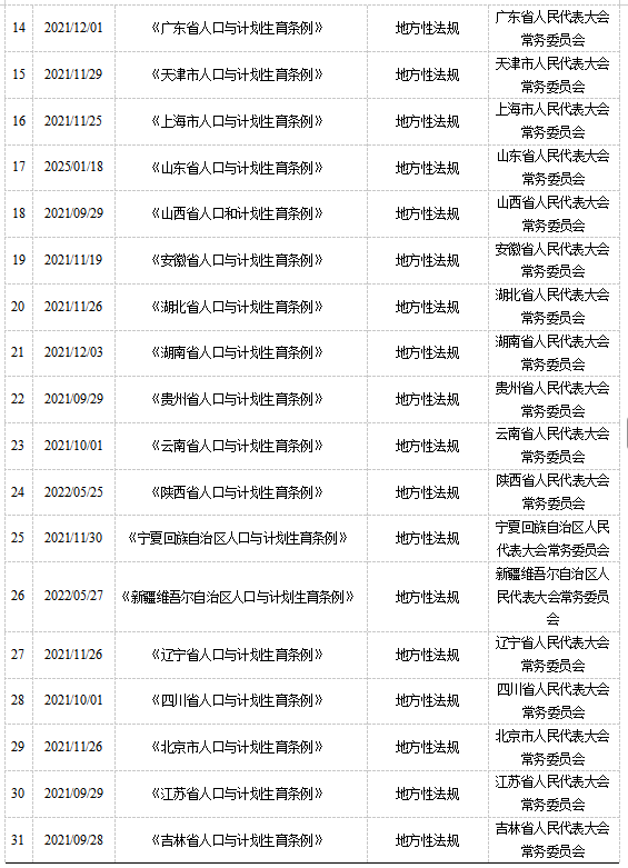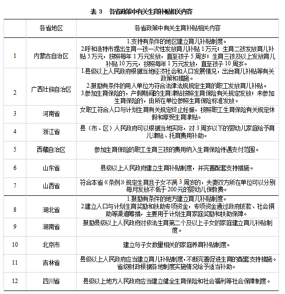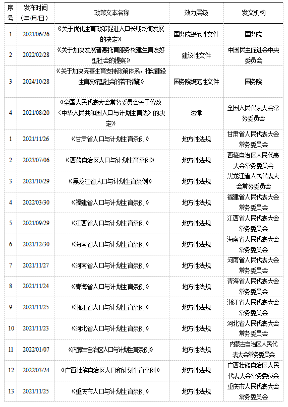 [参考文献] [1]国家统计局.中国统计年鉴[M].北京:中国统计出版社,2024:28. [2]国家统计局.第七次全国人口普查主要数据[EB/OL].(2021-05-11).http://www.stats.gov.cn/sj/pcsj/rkpc/d7c/. [3][4]穆光宗.低生育危机与生育友好型社会构建[J].人民论坛,2023(15):17-21. [5][16]吴帆.何以生育友好?——基于国际经验和中国情境的分析[J].中华女子学院学报,2022,34(2):36-43. [6]刘晓光,侯晓菁.中国农村生态文明建设政策的制度分析[J].中国人口·资源与环境,2015,25(11):105-112. [7]山西省人民代表大会常务委员会.山西省人口和计划生育条例[C].山西省第十三届人民代表大会常务委员会第三十一次会议第二次修订,2021.9.29. [8][25]内蒙古自治区人大官网.内蒙古自治区人口与计划生育条例[C].内蒙古自治区第十三届人民代表大会常务委员会第三十三次会议《关于修改〈内蒙古自治区人口与计划生育条例〉的决定》第六次修正,2022.01.07. [9]广西壮族自治区人民代表大会常务委员会.广西壮族自治区人口和计划生育条例[C].广西壮族自治区第十三届人民代表大会常务委员会第二十八次会议,2022.03.24. [10][22]浙江省人民代表大会常务委员会.浙江省人口与计划生育条例[C].浙江省第十三届人民代表大会常务委员会第三十二次会议,2021.11.25. [11]晏圣娇.生育友好型社会目标下生育福利对生育意愿的影响研究[D].上海:华东师范大学,2023. [12]焦玉香.育儿假期制度的生育意愿激励作用研究——以北京市为例[D].中国科学院大学,2022. [13]河北省人民政府.河北省人口与计划生育条例实施细则[C].河北省人民政府令〔2023〕第1号第三次修正,2023.01.20. [14][27]安徽省人民代表大会常务委员会.安徽省人口与计划生育条例[C].安徽省第十三届人民代表大会常务委员会第三十次会议修订,2022.01.01. [15]江西省人民代表大会常务委员会.江西省人口与计划生育条例[C].江西省第十三届人民代表大会常务委员会第三十二次会议第四次修正,2021.09.29. [17]李婉鑫,杨小军,杨雪燕.儿童照料支持与二孩生育意愿——基于2017年全国生育状况抽样调查数据的实证分析[J].人口研究,2021(5):64-78. [18][24]天津市人民代表大会常务委员会.天津市人口与计划生育条例[C].天津市第十七届人民代表大会常务委员会第三十次会议,2021.11.29. [19]上海市人民代表大会常务委员会.上海市人口与计划生育条例[C].上海市第十五届人民代表大会常务委员会第三十七次会议《关于修改〈上海市人口与计划生育条例〉的决定》第三次修正),2021.11.25. [20]广东省人民代表大会常务委员会.广东省人口与计划生育条例[C].广东省第十三届人民代表大会常务委员会第三十七次会议《关于修改〈广东省人口与计划生育条例〉的决定》第九次修正),2021.12.01. [21]人民网-中国共产党新闻网.民进中央:关于加快发展普惠托育服务构建生育友好型社会的提案[EB/OL].(2022-02-28).http://cpc.people.com.cn/n1/2022/0228/c442045-32361816.html. [23]重庆市人民代表大会常务委员会.重庆市人口与计划生育条例[C].重庆市第五届人民代表大会常务委员会第二十九次会议决定,2021.11.25. [26]新华社.中共中央关于制定国民经济和社会发展第十四个五年规划和二〇三五年远景目标的建议[EB/OL].(2020-11-03).http://www.qstheory.cn/yaowen/2020-11/03/c_1126693429.htm. [27]郑功成.多层次社会保障体系建设:现状评估与政策思路[J].社会保障评论,2019(1):3-29. [28]国务院办公厅.关于加快完善生育支持政策体系推动建设生育友好型社会的若干措施[EB/OL].(2024-10-19).https://www.gov.cn/zhengce/zhengceku/202410/content_6983486.htm. [29]崔应令.生育支持的制度、观念与文化建设:人口均衡发展的路径探索[J].理论月刊,2023(8):110-119. [30]杨文庄.新时代背景下托育服务高质量发展的政策与展望[J].早期儿童发展,2024(01):5-10. [31]丛中笑,佘宇,杨慧,等.推进托育机构高质量建设,促进托育服务行业可持续发展[J].早期儿童发展,2024(01):11-19. [32]李志,吴永江.育龄青年的生育价值观影响生育计划的调查研究——基于生育支持的中介作用分析[J].中国特色社会主义研究,2022(Z1):84-96. 基金项目:本文系重庆市社会科学规划年度一般项目“重庆市城乡普惠托育服务资源有效供给研究(2023NDYB139)”、重庆市教育科学规划2024年度重点课题“托幼一体化背景下幼儿园托育服务条件保障研究(K24YB2050067)”和重庆市教育委员会人文社会科学研究项目“人口高质量发展背景下重庆普惠托育服务建设研究”(25SKJD080)的阶段性成果。 作者简介:宋志均,重庆师范大学教育科学学院硕士研究生;邵小佩,通讯作者,重庆师范大学教育科学学院教授、重庆市妇女儿童发展中心研究咨政平台负责人,硕士生导师,研究方向:学前教育课程与教学、学前教育基本理论。