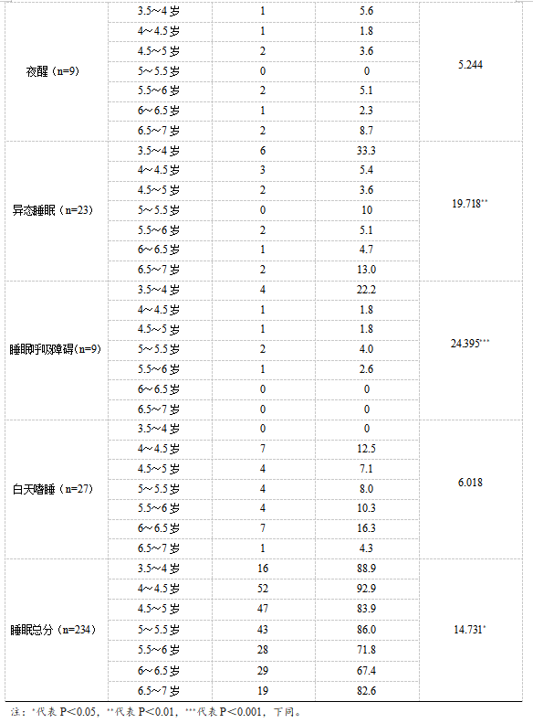 2.不同性别及年龄组学龄前儿童睡眠问题的发生率差异统计 对不同性别及年龄组学龄前儿童的睡眠问题发生率进行差异性统计分析得出,不同性别学龄前儿童的各类睡眠问题及总体发生率均不存在显著性差异(P>0.05)(见表3)。学龄前儿童总体睡眠问题的发生率(X²=14.731,P<0.05)在年龄上的差异显著性较低;而异态睡眠(X²=19.718,P<0.01)和睡眠呼吸障碍(X²=24.395,P<0.001)方面的发生率在年龄上的差异明显(见表4)。图1为不同年龄组儿童在异态睡眠、睡眠呼吸障碍和总体睡眠问题方面发生率的趋势图。在3.5~4岁阶段,学龄前儿童异态睡眠及睡眠呼吸障碍的发生率最高,其后呈下降趋势;在4~4.5岁阶段,总体睡眠问题发生率最高;在5~5.5岁阶段,学龄前儿童总体睡眠问题、异态睡眠及睡眠呼吸障碍的发生率缓慢上升,其后则缓慢下降;在6.5~7岁阶段,学龄前儿童总体睡眠问题及异态睡眠的发生率出现再次上升趋势。