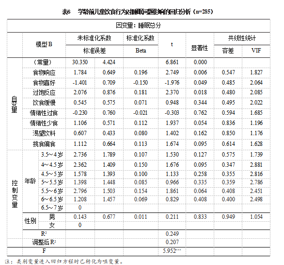 结果显示,学龄前儿童睡眠总分与饮食总分存在低度的正相关关系(r=0.385,P<0.001),其得分维度之间相关度较低(|r|<0.5),但有多项达到显著水平(P<0.05)。其中“食物喜好”与睡眠总分及“睡眠持续时间”“白天嗜睡”显著负相关,“过饱反应”与睡眠总分及“睡眠阻抗”“睡眠持续时间”“异态睡眠”“白天嗜睡”等显著正相关,“挑食偏食”与睡眠总分及“睡眠阻抗”“白天嗜睡”显著正相关,说明饮食行为与多种睡眠问题之间存在显著相关,如偏好高能量食物、含糖饮料等会导致白天觉醒度高,但睡眠持续时间短的问题,进食过多、饮食结构单一等则会导致深度睡眠不够、白天觉醒度不高等问题,这些不良的饮食行为如果持续过久会带来神经系统的兴奋与抑制功能失调的潜在风险。 (三)学龄前儿童饮食行为与睡眠问题的线性回归分析 以睡眠总分为因变量,以学龄前儿童饮食行为各维度为自变量,将学龄前儿童性别、年龄作为控制变量,进行多元线性回归分析。经共线性诊断后,各自变量VIF值为1.054~2.881,排除共线性可能。