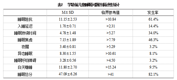 (二)研究工具 1.儿童睡眠习惯问卷 儿童睡眠习惯问卷(Children’s Sleep Habits Questionnaire,CSHQ)中文版由李生慧等[15]引进并修订,具有良好的信效度,适合我国儿童使用。该问卷采用儿童的照护人填写的方式,共45道题,可以分为8个维度,包括入睡延迟、睡眠阻抗、睡眠持续时间、夜醒、异态睡眠、睡眠焦虑、睡眠呼吸障碍和白天嗜睡。问卷采用三级计分,按各类睡眠问题发生的频次分别计3、2、1分,频次越高,计分越高,对应的分类睡眠问题越严重,总分大于41分即表明儿童具有一定的睡眠问题。该问卷数据的Cronbach’s α为0.747,内部一致性良好。 2.儿童饮食行为量表 儿童饮食行为量表(The Children’s Eating Behavior Questionnaire,CEBQ)[16]是目前较广泛使用的儿童饮食行为测量工具之一,本研究参考了曾思瑶[17]使用过的中文版本。该问卷由儿童的照护人填写,共35个条目,从8个维度对儿童的饮食行为进行评估,包括食物喜好、情绪性过食、过饱反应、渴望饮料、食物响应、饮食缓慢、情绪性少食和挑食偏食。评估采用五级计分,按行为发生的描述性评估分别计“1、2、3、4、5”分,行为发生越频繁,计分越高。该问卷数据的Cronbach’sα为0.777,内部一致性良好。 3.统计学方法 使用Epidata3.1软件进行数据录入,采用Harman单因素检验法进行共同方法偏差检验,第一公因子的方差解释百分比为11.56%,小于30%,不存在共同方法偏差。用SPSS 22.0统计软件进行数据分析,在对研究样本的睡眠问题和饮食行为进行描述统计的基础之上,采用多元线性回归分析学龄前儿童饮食行为对睡眠问题的影响及影响程度。 二、研究结果 (一)学龄前儿童睡眠问题描述统计 1.学龄前儿童睡眠问题总体描述统计 参考已有临床临界值,确定学龄前儿童睡眠问题的发生率。学龄前儿童的总体睡眠问题发生率高达82.1%,各类型睡眠问题的发生率为3.2%(夜醒和睡眠呼吸障碍)~61.4%(睡眠阻抗)。各类睡眠问题中,睡眠阻抗的发生率最髙,为61.4%;睡眠焦虑和睡眠持续时间也十分普遍,发生率分别为46.3%和34.0%。学龄前儿童睡眠问题的描述性统计结果见表2。