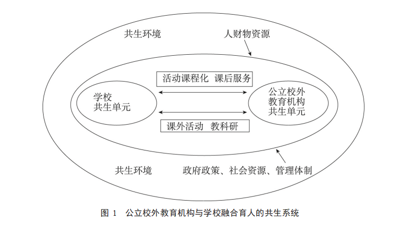 2021 年 7 月,中共中央办公厅、国务院办公厅印发了《关于进一步减轻义务教育 阶段学生作业负担和校外培训负担的意见》(以下简称“双减”),明确指出“发挥好 少年宫、青少年活动中心等校外活动场所在课后服务中的作用”。当“双减”政策正式 把校外教育活动纳入学校教育体系中时,越来越多的公立校外教育机构开始参与到学校课后服务、研学活动和家庭教育指导活动中,这就意味着它不再是学校教育的补充, 而是作为学校教育的一个重要组成部分,需要全面通盘考虑校外课程与校内课程的衔 接、与学生学段的衔接、与学生发展需求的适应,从而使学校教育和校外教育呈现出 密切互动、齐头并进、全方位融合的趋势。 随着人类开始迈入互联网时代,云计算、大数据、生成式人工智能等技术的迅猛 发展,学校的内外环境、组织形式和功能作用正在发生巨大变化,学校成为开放的空 间,学校教育与校外教育共生,校外实践活动与学校课堂学习并存,学校与公立校外 教育机构育人并进的大教育格局正在逐步形成。2024 年 11 月,教育部等十七部门联合 颁布了《家校社协同育人“教联体”工作方案》,要求进一步推动各地家庭、学校、社 会紧密合作,建立起家校社协同育人有效的“教联体”。 可见,校外教育作为教育体系的重要组成部分,既是教育高质量发展的重要突破口,又在家校社协同育人中发挥着不可替代的作用。因此,探索公立校外教育机构与 学校的共生关系,尤其是融合育人的模式,是新时代校外教育的题中应有之义。 一、共生理论:校内外融合育人的新思路 (一)共生理论的基本内涵 “共生”这一概念最早是由德国生物学家德贝里提出的,他认为共生是指生物体间 通过不同属种之间资源或功能的动态互补,形成共同生存、协同进化的共生系统。该 系统包含共生单元、共生环境和共生模式三个要素,共生单元是基础,共生模式是关 键,共生环境是重要的外部条件 [1]20。共生理论可以准确地分析系统内各主体间的相互 关系,深入地诠释系统内共生关系的本质。也就是说,合作是共生现象的本质特征之 一,各主体之间不是彼此相互替代,而是相互补充、互为促进;不是自身优势的丧失, 而是自身优势的继承和保留。同时,共生关系的本质还表现为共生能量的生成,体现 了共生关系的协同作用和创新活力,这是检验是否达到共生的最终标准 [2]218。20 世纪五六十年代,共生的概念及其理论经过演变,逐渐成为解释不同组织间关 系的理论框架,被广泛应用到经济、教育、管理和政治等众多领域。 (二)校内外融合育人的共生系统的建构 首先,共生系统的基本要素之一是共生单元,它是构成共生关系的基本能量生成 和交换单位,也是塑造共生系统的重要动力来源 [3]102。在校外教育中,一般由组织来组 成,政府以及教育行政部门、学校、公立校外教育机构、家庭、社会企事业单位均是共生单元。 其次,共生系统的基本要素还包括共生模式,它是以资源为纽带的共生单元之间 相互依赖、彼此作用的方式。一般来说,共生单元在相互作用中会产生共生能量,其 相互作用的方式和强度不同,会形成不同类型的共生模式,其中完善的、动态的共生模式承载着信息传输和物质资源交流的功能,有助于二者在合作中实现共同目标。 最后,共生系统中的共生环境,是指共生单元外部影响共生状态达成的各种条件 或外部因素,包括法规政策、经济条件、社会氛围、文化氛围、人力财力物力资源等, 这些因素对共生系统的影响是不同的,有直接和间接的,有主要和次要的,还有积极 和消极的 [1]24。优质健康的共生环境具有较强的正外部能量引领,能促进共生单元与共 生环境之间的动态均衡发展。 本研究基于共生理论中的共生单元、共生环境和共生模式,初步构建起校内外融 合育人的共生体系,表明共生理论具有一定的理论适切性。 二、共生单元角色认知清晰,促进互惠共生模式形成 本研究中的“北京市公立校外教育机构”仅指由北京市教育行政部门主办、以未 成年人为主要服务对象、以提供中小学生校外教育服务为主要职责的单位,具体包括 少年宫、青少年活动中心、青少年科技馆、少年之家等。截至 2024 年底,市、区两级 教委管理的公立校外教育机构有 49 家,遍布全市 16 个区。而其他校外机构, 图书馆 (如首都图书馆)、博物馆(如首都博物馆)、科技馆(如北京自然博物馆、天文馆)、 美术馆(如中国美术馆、今日美术馆)等是由政府、社会文化机构、企事业单位等兴 建举办的,它们把中小学生校外教育活动作为社会公益职责的一部分,通常被称为社 会教育,不是本文讨论的对象。本研究的共生单元是指学校以及以少年宫、科技馆为 主的公立校外教育机构。 有学者指出,“角色的作用是为角色扮演提供基础行动的框架”[4]362 。共生单元要 对自身权利与义务有清晰的认知与界定,这是各方参与融合育人的前提,也是形成互 惠共生模式的必要条件。若共生单元的角色意识模糊,对角色规范认识不足,就会造 成共生单元之间彼此疏离,难以实现优势互补和共生发展,难以真正建构良好的校内 外融合育人模式。 2006 年,中共中央办公厅、国务院办公厅颁发了《关于进一步加强和改进未成年 人校外活动场所建设和管理工作的意见》,明确了校外教育的功能,确立了校外教育的 主