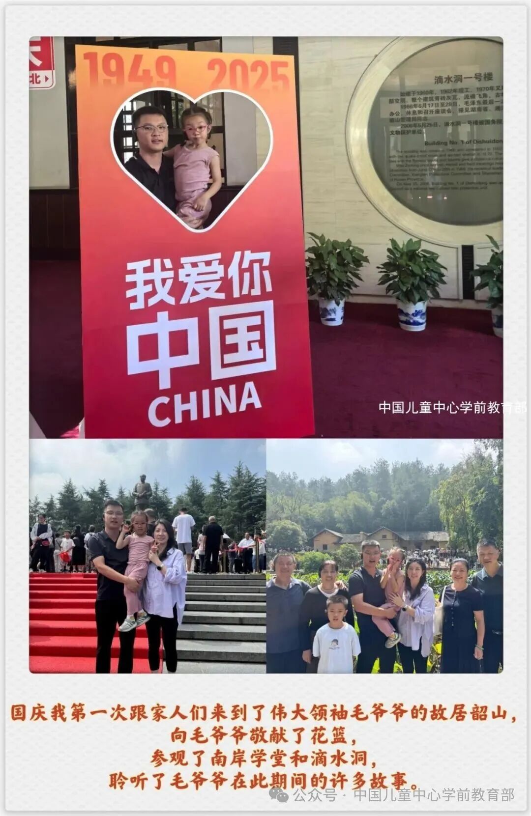 我们山东省妇女儿童活动中心幼儿园华润城分园还组织“科技时装秀”,用废旧材料制作“航天服”“机器人”服装,我们可开心呢!更喜欢与爸爸妈妈爷爷奶奶姥姥姥爷创作出作品。 我们要像小树苗一样,在浓浓的爱国情里,慢慢长大! 老师会带我们玩更多爱国游戏,唱更多爱国儿歌,听更多英雄故事。让心里那颗叫“爱国”的小种子,长出最多的根,开出最漂亮的花。 等我们长大了,要用自己的本领,把我们的祖国妈妈建设得更加漂亮、更加强大! 老师的话:老师们期待孩子们能在爱国情怀的滋养下,眼中有光,心中有梦,脚下有路,好好学习长本领,长大后,成为心怀家国、对国家能做出大贡献的有用之才! 结束语: 这就是我们心中的家与国的样子! 请您快来吧!从美丽的青藏高原到蔚蓝的东海之滨,祖国妈妈的大江南北都在等着大朋友、小朋友去用心发现、不断探索、快乐分享呢! 让我们一起手拉手,把这片热土里最动人的故事和最美的风景,都装进我们心里吧! |