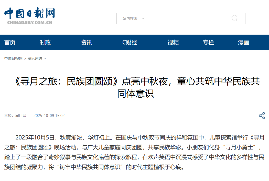 【中国日报】报道中国儿童中心老牛儿童探索馆《寻月之旅:民族团圆颂》点亮中秋夜,童心共筑中华民族共同体意识