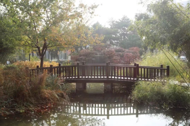 曲径通幽处,几度秋意浓。竹园里翠竹敲秋,瀑泉飞泄,迸珠溅玉,画桥卧波,藤蔓轻垂。池水清浅见底,曾几何时,赤麻鸭一家在此嬉戏,诉说着人与自然和谐共处的温馨故事。