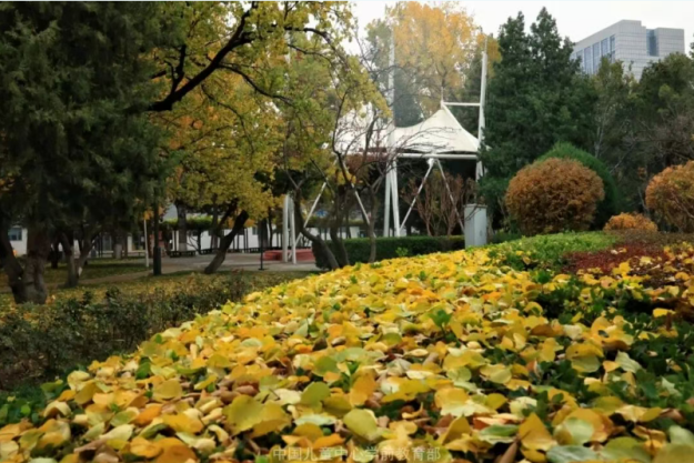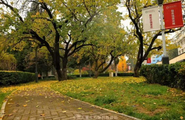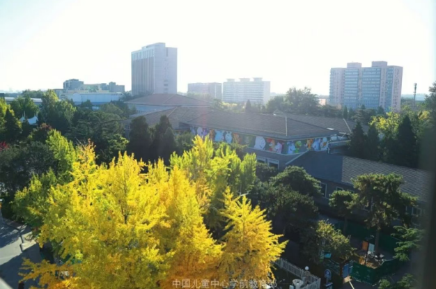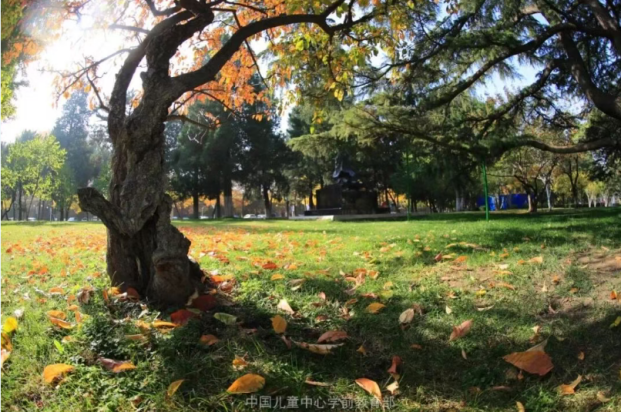 在B座西侧的银杏林,挺拔的枝干撑起一片金色的华盖,与铺金叠翠的草坪相映成趣。阳光穿过枝叶,洒下满地碎金,恍惚间,仿佛步入一个金色的童话世界。这金色,不正是中国儿童中心人四十余载坚守使命的生动写照么?他们在这醉人的光景中汇聚力量,托举起明天的太阳。