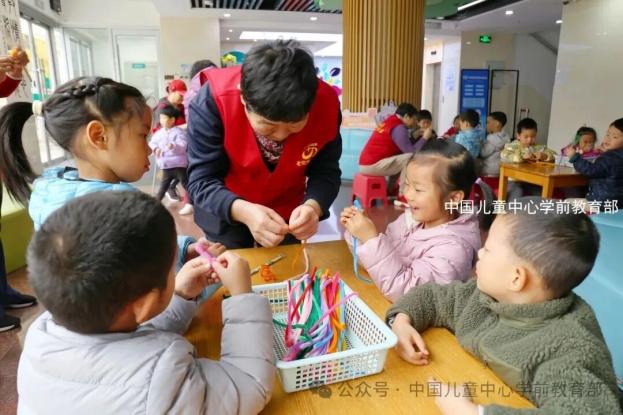 为深入贯彻落实习近平总书记致中国儿童中心成立40周年贺信精神,践行为党育人、为国育才的初心使命,2025年11月5日,中心第八党支部精心策划开展了“巧手编织传温情,老少同行暖深秋”主题党日活动。此次活动依托学前教育部近8年来在家校社协同共育领域的实践研究成果,以构建儿童成长新生态为目标,通过组织中心党员、社区党员、社区志愿者与幼儿之间的互动,搭建起老少沟通的暖心桥梁。 活动在中国儿童中心教学楼一层大厅举行,邀请了南小街社区党员与幼儿家长志愿者共同参与,构建了“长者-中青年-幼儿”三代同堂的温馨场景。这不仅是一次手工创作活动,展现了党员在社区服务中的先锋模范作用。 文化启幕,温情相伴 活动在党员教师充满活力的开场中拉开帷幕。社区志愿者们通过生动讲述我国的传统文化,引导孩子们感受季节更替中的人文关怀。社区党员们展示了精心制作的季节主题编织作品,瞬间点燃了孩子们的参与热情。