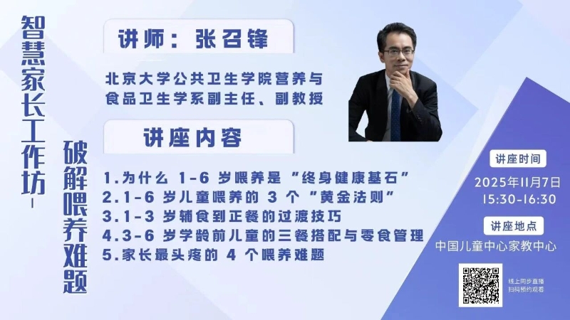 我们将邀请北京大学公共卫生学院营养与食品卫生学系副主任、副教授张召锋博士为1-6岁儿童家长带来“破解喂养难题:1-6 岁宝宝这样喂就对了”的讲座