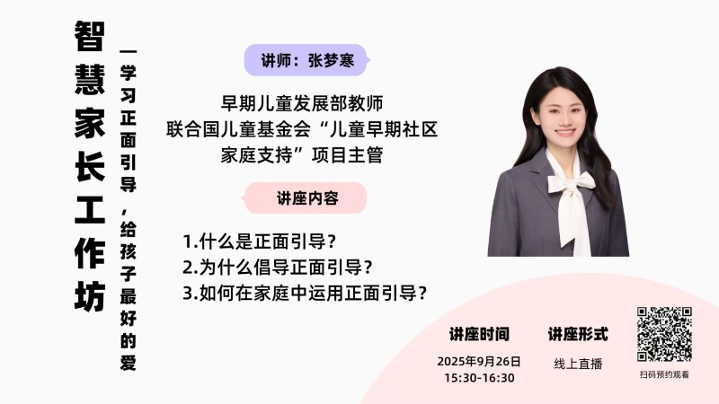 孩子总会哭闹或者发脾气,这个时候,家长该如何应对?正面引导是一种区别于管教的教育方式,能够让我们更加理性对待孩子,早期儿童发展部将邀请部门项目主管张梦寒老师为大家带来“学习正面引导,给孩子最好的爱”的讲座。
