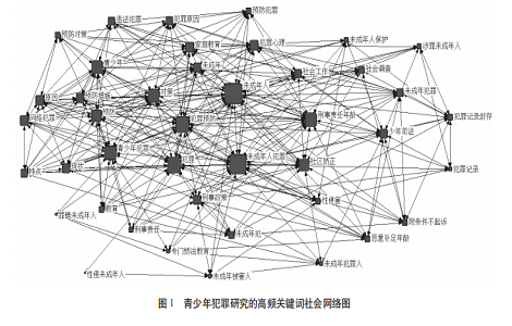 (二)社会网络分析 文章借助 UCINET 软件和 NetDraw 软件生成关键词社会网络图谱,如图 1 所示。从图 1 可以看出,每一个节点代表一个关键词,节点越大代表关键词频次越高,节点间的连线则代表关键词间的联系。青少年犯罪研究的关键词社会网络图谱呈现出整体分散与部分集中的特点。“未成年人犯罪”“青少年犯罪”“犯罪”等关键词位于核心位置,周围连线密集,分别指向“刑事责任年龄”“社区矫正”“恶意补足年龄”“预防措施”“犯罪心理”等高频词,并形成研究热点次中心。此外,在整个网络的外围,还存在零散关键词。这种网络形态也表明,我国“青少年犯罪”研究领域存在许多交叉关联的热点研究问题。