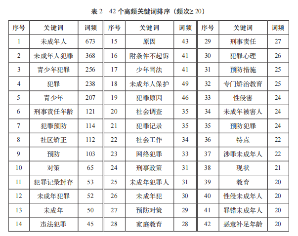 (其中,M 是目标高频关键词的最低频次,Nmax 是关键词的最高频次)。通过分析数据可知,将 Nmax 所代表的关键词的最高频次即 673 代入公式,得到M 值为 19.43。按照取整原则,将频次大于等于 20 的关键词定义为青少年犯罪研究的高频关键词,符合条件的关键词有 42 个,具体如表 2 所示。根据表 2 可以发现,存在多个同义词,进一步归并之后再排除青少年犯罪、青少年、犯罪、未成年人犯罪等主体关键词之外的热点关键词(包括预防、对策、原因、犯罪心理、家庭原因、刑事责任年龄、网络犯罪等)。这一结果也初步表明,我国学术界对“青少年犯罪”的研究主要围绕青少年犯罪原因、青少年预防犯罪等展开。为进一步了解关键词间的内在关系,需要后续思考挖掘“青少年犯罪”领域的研究热点。