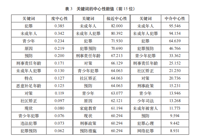 依托 UCINET 对高频关键词的度中心性、接近中心性、中介中心性等数据进行测 定,能够更加客观地梳理“青少年犯罪”研究的各个研究分支,揭示研究地位。根据 各中心性数值排序,因全部 42 个关键词表格过大,特选取前 15 位进行分析,如表 3所示。具体来看,度中心性代表关键词的重要程度,数值越高越重要。接近中心性反 映个体之间的紧密关系,数值越小,则越可能是该网络的核心点 [5] 。中介中心性衡量的 是行动者对资源控制的程度,在各个关键词中起桥梁作用,数值越高,说明关键词所涉及的研究问题越突出 [6] 。从表 3 可以看出,“刑事责任年龄”“犯罪预防”“社区矫正”等在表格中数值突出的关键词与表 2 中的高频词基本一致,这些词汇也预示着未来的 研究热点与研究趋势。