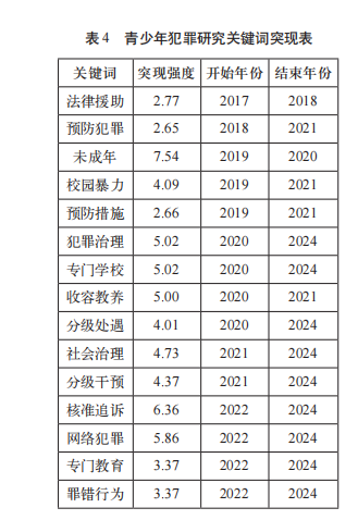2. 青少年犯罪预防研究 青少年犯罪预防工作是一项极其复杂的系统工作,需要多方联动,从而预防和减少青少年犯罪。为预防青少年犯罪,学者展开了众多研究。刘仁钊认为,在预防青少年犯罪的思政对策方面,可以通过弘扬美德、全面普法、心理引导等手段进行提前干预 [13] 。于龙在青少年犯罪特征分析和青少年犯罪成因分析基础上提出,可以通过创新社区矫正模式与构建社会关系体系预防青少年犯罪 [14] 。王旭关注边疆地区典型青少年犯罪问题,认为边疆地区在继续发展经济的同时,学校与家庭层面都需要更加关注未成年人的成长环境 [15] 。除此之外,国外青少年犯罪预防经验也值得关注。路琦通过借鉴美国青少年犯罪社区预防干预实践经验,认为在具体的干预方面要避免威慑或说教类的项目,避免非结构化的技能培训项目等 [16] 。法国面对日益突出的青少年问题,开始通过多渠道搜集青少年犯罪信息以出台各种预防项目 [17] 。从国内外学者的研究成果可以看出,青少年犯罪预防工作需要多方联动,进而集中力量,达到有效预防。 3. 青少年犯罪的刑事政策研究 2024 年,共青团中央、最高人民法院、最高人民检察院、司法部四部门联合印发《关于加强新时代预防青少年违法犯罪工作的意见》,提出“力争用 5 年时间,推动出台一批预防青少年违法犯罪的法律法规和政策举措,促进青少年法治素养不断提升,违法犯罪分级预防、干预和矫治体系更加完善”。近年来,青少年恶性犯罪事件频发,也引发了对于青少年刑事政策的争议,主要集中于探讨青少年保护与惩治之间的处置对策。董冰、陈文斌提到,未成年人犯罪的刑事政策经历了萌芽期、确立和虚位化时期、初步落实时期、部分内容法定化时期四个阶段 [18] 。崔志伟认为,未成年人犯罪刑事政策的争议焦点在于保护政策的偏绝对化与刑事处遇的适当性 [19] 。很多学者也在讨论恶意补足年龄在中国的适用性,如马松建、潘照东对“恶意”的认定与“恶意”的证明标准进行了定义 [20] 。杨统旭认为,理论上刑事责任年龄已经不符合实际 [21] 。针对未成年人刑事政策领域,建议学术界未来要继续讨论我国涉及青少年犯罪刑法的完善方案,推动我国刑法的整体发展。 4. 专门学校与矫治教育研究 根据教育部和最高检察院的公开信息,专门学校是对有严重不良行为的未成年人进行专门教育的学校。专门教育是国民教育体系的组成部分,是对有严重不良行为的未成年人进行教育和矫治的重要保护处分措施。截至 2024 年 7 月,我国专门学校达230 所,覆盖了 31 个省、自治区、直辖市。相关研究主要包括以下两方面。一是关于专门教育高质量发展的研究。专门教育存在教学生态环境不佳、内容丰富性不足、教育方式方法单一等现实问题 [22] 。专门学校的教师能力也有不足,尤其是在专门学校教师教育转化领域,自身匹配度不高、专业化不强、科学性不足等问题较为突出 [23] 。部分学生存在对切身相关的违法认知不全面、法律观念不足等问题 [24] 。二是关于专门教育经验地区借鉴的研究。李琦对比了我国台湾地区的矫正学校的教育特色,认为其关注学生离校就业,并且会借助社会资源为学生回归社会提供辅助 [25] 。瑞典作为福利性国家,通过立法发挥社会福利的优势,明确开展矫正训练并对犯罪青年处罚金 [26] 。专门教育作为青少年犯罪矫治的专门机构发挥了重要作用。未来学术界应针对目前矫治教育存在的实际问题,思考如何充分发挥专门学校的作用,使矫正细则落在实处。 (四)突现词分析 突现词代表某一时段内被引次数突然增加的关键词,在一定程度上能够显示某一领域的研究趋势 [27] 。如表 4 所示,突现强度较高的词汇有“犯罪治理”“专门学校”“分级处遇”等。在研究热度上,突现词普遍持续 2 ~ 4 年,研究持续性不强,也说明一些话题的学术研究热度仅停留在一段时间。 突现阶段大致分为三个阶段。2017—2018 年,“法律援助”一词研究热度高。2017年,最高人民法院、司法部联合发布了《关于开展刑事案件律师辩护全覆盖试点工作的办法》,在涉青少年犯罪案件方面,法律援助能够进一步保障青少年的合法权益。 2018—2021 年,研究聚焦校园暴力。该阶段出现过数起有不良影响的校园暴力事件,这一阶段上映的青春伤痛电影也引起社会反思,促使学术界抓住热点开展了一系列关于校园暴力防治的研究。 2022—2024 年,关注青少年犯罪治理与全面干预,突现词如“分级干预”“核准追诉”“网络犯罪”“专门教育”等。此类研究着重关注新媒体背景下青少年网络犯罪的成因与对策探讨,同时呼吁解决好恶性低龄犯罪的核准追诉问题。突现词持续时间最长的是“预防措施”“专门学校”“分级处遇”,持续了 5 年,是 2020—2024 年较具影响力的研究前沿,同时也是持续至今的前沿热点,说明学界长期关注青少年犯罪的预防措施,尝试寻求降低青少年犯罪率的有效方法。