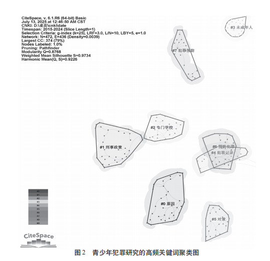 摘 要:为系统探讨我国青少年犯罪领域的研究现状与前沿动态,本研究利用计量软件对中国知网收录的 2015—2024 年关于青少年犯罪的 2 655 篇相关论文进行可视化分析。研究表明,青少年犯罪研究在数量上呈明显下降态势,机构间合作不紧密,其研究热点多围绕青少年犯罪原因、青少年犯罪预防、青少年犯罪的刑事政策、专门学校与矫治教育等展开。近 10 年来,青少年犯罪研究的内容体系和方法体系基本成熟,但仍然缺乏应对复杂青少年犯罪问题的创新性举措。未来的青少年犯罪研究依然要突出关注如何筑牢青少年群体精神之基,塑造更加健康的青少年群体,不断促进青少年健康发展。 关键词:青少年犯罪;文献计量;矫治教育 中图分类号:{D924.41} 文献标识码:A 文章编号:1004-8502(2025)06-0043-12 作者简介:冉鑫,保定理工学院马克思主义学院助教;李曼竹,中国社会科学院大学社会与民族学院博士研究生。 青少年作为祖国的花朵与未来,其健康成长关乎家庭美满与社会稳定。随着我国未成年人法治体系日益健全,预防青少年违法犯罪工作日趋成熟,未成年人心理健康教育也在逐渐加强。相较于成年人犯罪数量,青少年犯罪数总量不高,但青少年犯罪呈现低龄化趋势,在个别典型青少年犯罪案件发生后,经媒体发酵引起的舆论反响较大,社会关注度较高。2025 年发布的《刑事检察工作白皮书(2024)》显示,2024 年未成年刑事犯罪数量上升,犯罪类型集中,2024 年受理审查起诉未成年犯罪嫌疑人101 526 人,同比上升 4.3%[1] 。因此,关注青少年犯罪问题是极具积极现实意义的。近年来,学术界围绕青少年犯罪的研究成果已经较为成熟,有大量关于青少年犯罪新特点、矫正经验、心理健康等方面的研究。鉴于当前缺乏对某个阶段青少年犯罪研究进行系统梳理的文章,本文拟借助专业软件对青少年犯罪问题的相关文献进行计量统计与可视化分析,以期对未来青少年犯罪研究形成参考价值,从而进一步营造青少年友好社会的氛围。 一、研究技术路线 (一)研究思路与方法 近 10 年来,青少年犯罪研究相关论文发表数量整体呈下降态势,2024 年有所上升。为具体探求青少年犯罪的研究特点,思考研究态势,本文尝试对最近 10 年关注青少年犯罪话题的学术论文的研究现状进行整体回顾。首先通过样本收集与清洗形成研究的基本数据,然后通过 SATI 文献题录软件对基本数据的文献发文量、作者情况、期刊情况、机构情况等进行细分数据的描述性统计,从而对青少年犯罪研究的文献产出结构形成基本认知。在研究热点方面,对样本数据的关键词进行提取并确定高频关键词之后,借助 UCINET 软件和 NetDraw 软件形成关键词的社会网络图谱,使研究热点直观化、可视化,并进一步利用 CiteSpace 软件对热点关键词进行聚类分析,形成几大研究热点。最后结合 CiteSpace 生成的突现词对研究阶段与研究趋势进一步总结。 (二)样本文献收集 本研究将中国知网数据库的相关主题文献作为数据来源。通过高级检索,以“青少年犯罪”“未成年人犯罪”等作为检索条件,来源不作限定,时间范围设定为 2015年至 2024 年,其他条件由系统默认。经过数据清洗,把书评、会议综述、简讯等不符合本研究设计的非学术类文献剔除,共得到 2 655 篇有效样本文献。为了便于统计研究,本文将有效文献以 EndNote 的格式保存,以备后期导入计量软件。 二、文献产出情况统计 通过中国知网检索共选取 2015—2024 年发表的相关论文 2 655 篇,平均每年发表论文 265.5 篇。从近 10 年的发文走势可以看出,青少年犯罪相关研究发文量大致呈下降趋势,尤其是 2022—2024 年维持在 200 篇以下,发表数量峰值为 2015 年的 372 篇。 2015 年是全面推进依法治国的开局之年,在依法治国方面还特别提到“把法治教育纳入国民教育体系,从青少年抓起,在中小学设立法治知识课程”。此后,学术界关于该做法展开讨论,在肯定国家青少年权益保护进步的同时,也在思考如何通过教育进一步培养青少年的法律意识。2020 年出现的发文量次高峰为 324 篇,这一年,刑法对刑事责任年龄进行了调整,这也在一定程度上引发学界热议。发表数量最低值为 2023 年的 143 篇,这在一定程度上说明近年来青少年犯罪研究领域热度持续下降,也说明稍早时间对于青少年犯罪原因、犯罪治理等的基础讨论较多,后来学者开始转向其他新兴话题,该现象是研究热度的自然衰退。2024 年发文量又增至 199 篇,这与社会上出现涉及青少年犯罪的重大恶性事件有关,使得学术界再次将目光聚焦在青少年犯罪问题方面。 对期刊来源进行统计发现,2 655 篇论文发表在 575 种期刊上。载文量超过百篇的有 4 种期刊,分别为《法制博览》《法制与社会》《预防青少年犯罪研究》《青少年犯罪问题》。4 种期刊共载文 1051 篇,占全部文献的 39.6%。其中《法制博览》载文量最高,为 413 篇,占 15.5%。《法制与社会》载文量居第二,共载文 253 篇,占总发文量的 9.5%。但是,该刊在知网平台只收录至 2021 年第 24 期。《预防青少年犯罪研究》载文量居第三,共载文 214 篇,占总发文量的 8.1%。《青少年犯罪问题》载文量居第四,共载文 171 篇,占总发文量的 6.4%。 发文量靠前的期刊大多为法治类期刊或者青少年研究的专业期刊,也进一步说明国内青少年犯罪研究成果具有一定的学科集聚性,有《青少年犯罪问题》和《预防青少年犯