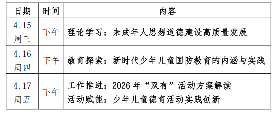 各相关单位: 为深入学习贯彻习近平总书记关于未成年人思想道德建设的重要论述,紧扣“十五五”规划纲要部署要求,落实立德树人根本任务,发挥校外教育活动育人优势,推动“双有”活动相关工作落实,提高儿童工作者的专业水平,中国儿童中心、全国少年儿童“双有”主题教育活动组委会将于2026年4月15日至17日举办“2026年全国校外活动部长暨骨干教师培训班(线上)”。 一、主题 未成年人思想道德建设活动的设计与组织 二、时间、平台 报名时间:2026年4月10日前 培训时间:2026年4月15-17日 授课平台:中国儿童中心直播平台(微信端、PC端) 三、参与对象 各地校外教育机构负责同志、活动部长、骨干教师,学校校长、少先队辅导员,儿童德育实践相关工作者等均可报名参加。 四、培训内容 面向开展未成年人思想道德建设活动的机构、教师与工作人员,举办专题培训,提供活动实践指导,提高专业水平,促进相关工作和活动创新发展。 日程安排(拟): 五、研修成果 学员完成全部学时可获得电子版结业证明,请各机构做好考勤管理,中心将在培训结束后公布电子证明提取链接,学员需在规定时间内下载保存,系统关闭后数据清空,不予补发。学员可在授课平台多次回看本次培训班的授课视频。 六、报名方式 本培训班免费。 请各单位于2026年4月10日前,以机构为单位统一提交报名信息。请准确填写报名统计表(详见附件),并发送至“双有”邮箱(shuangyou07@126.com)。提交报名表后,将为机构联系人建群,分享直播链接。 报名表内填写的姓名和手机号将作为电子版结业证明提取的关键信息,请核准后填写,因填写错误而无法提取证明,不予修改。 七、联系方式 全国“双有”活动组委会 联系人:周 瑛 电 话:010-66160151(办公室)、13701332112(周) 网 址:shuangyou.ccc.org.cn(“双有”官网) 全国少年儿童“双有”主题教育活动组织委员会 2026年3月17日 【通知】2026年全国校外活动部长暨骨干教师培训班(线上).pdf 2026年全国校外活动部长暨骨干教师培训班(线上)报名表.docx |