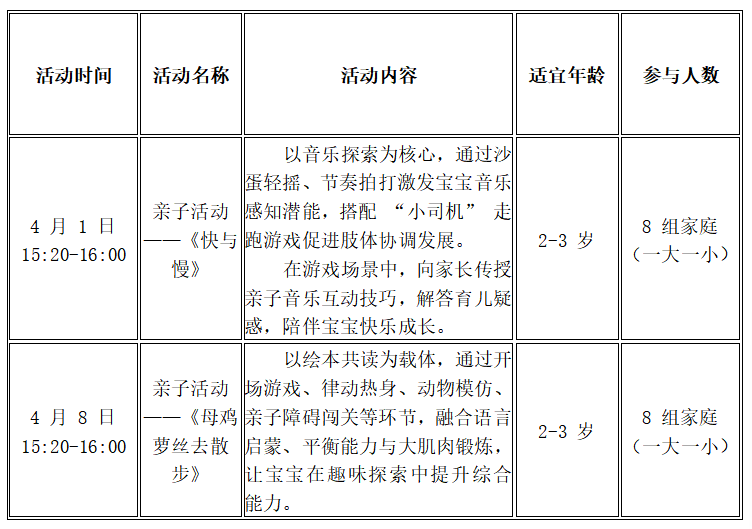 亲爱的家长朋友们: 为贯彻落实国家关于 “以人口高质量发展支撑中国式现代化” 的战略部署,积极响应西城区教委 “幸福西城、优托善育” 号召,深入推进托幼一体化发展,中国儿童中心早期儿童发展部和实验幼儿园,充分发挥专业资源优势,面向周边社区 0-3 岁婴幼儿及其家庭,常态化开展公益亲子活动。 活动以寓教于乐的亲子游戏为载体,促进婴幼儿全面发展,帮助家长理解儿童成长规律,掌握科学育儿与亲子沟通方法,共享温馨有爱的亲子时光。 在这春暖花开的四月,诚邀周边社区 2-3 岁婴幼儿家庭积极报名参与,让我们携手同行,在爱与发现中开启科学育儿的美好旅程! 活动介绍: 活动地点:中国儿童中心 综合楼B座 签到时间:活动开始前 10 分钟 (为保障其他课程的正常秩序,请3点10分后进场) 报名指南:如何预约报名?1. 选择场次→ 扫描文末二维码 → 填写信息 2. 先到先得,额满即止 重要承诺本次活动为纯公益性质,全程零费用 如无法参加,请务必提前取消,把机会留给等待中的家庭 请扫描下方二维码,填写信息,选择您想参加的活动场次   温馨提示:为了宝贝的安全与快乐 |健康守护| 活动当日请确认宝宝及家长身体健康(体温<37.3℃),如有发热、咳嗽、皮疹等症状请暂缓参与 |特殊告知| 如有过敏史、惊厥史等特殊健康状况,请提前告知教师 |全程陪伴| 家长须全程贴身看护,确保宝宝在视线范围内 |着装建议| 宽松衣物+平底鞋,进入活动区需更换专用袜套 |影像礼仪| 活动中可能拍摄记录,我们承诺严格保护隐私;请家长勿私自拍摄其他家庭 咨询通道:010-66023794;010-66165643