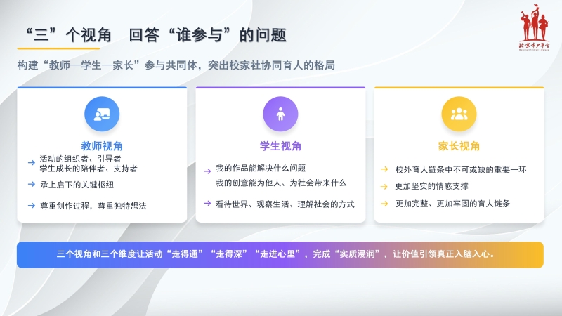 4月15日至17日,2026年全国校外活动部长暨骨干教师培训班(线上)圆满举办。本次培训活动集结全国校外教育同仁学习交流,聚焦未成年人思想道德建设,共谋德育活动新思路,共话校外教育新发展,努力实现“十五五”良好开局。来自全国29个省区市、158家单位的3000多名学员参加了培训。截至4月17日,线上培训累计3万余人次观看。 搭建平台 共同成长 主题教育活动是深化未成年人思想道德建设的重要抓手,“双有”活动是我国校外教育领域持续时间最长、影响范围最广的主题教育活动,中国儿童中心将“双有”活动与爱国主义、集体主义、社会主义教育紧密结合,用鲜明的时代主题引领、激励、推动少年儿童融入祖国的发展。 本次培训班围绕未成年人思想道德建设活动的设计与组织,从理论学习、教育探索、工作推进、活动赋能四个角度,与全国同仁一起梳理、学习、交流,提升专业水平,擦亮“双有”品牌。 理论学习 创新方法 中央团校(中国青年政治学院)原党委书记、常务副院长陆士桢教授围绕“未成年人思想道德建设”作了主旨报告。陆教授主要分享了未成年人思想道德建设的政治逻辑和理论基础,以及思想道德教育的方向、基本任务和未来发展思考。她提到,未成年人思想道德建设是教育的重要方向和任务,要坚持党的儿童青少年工作指导思想和基本原则,守住中国特色未成年人思想道德建设的本土化灵魂;要重视未成年人思想道德教育一体化的建设,健全学校家庭社会育人机制;要落实课程育人、活动育人、文化育人、管理育人、协同育人的实施路径;要研究未成年人接受思想政治教育、养成良好道德品格的客观规律,实现未成年人思想道德教育的创新发展。 主旨报告 中央民族大学教育学院副院长夏仕武教授就“新时代少年儿童爱国主义教育的内涵与实践”作了专题报告。夏教授围绕新时代爱国主义教育的时代背景与重大意义、内涵与特征,以及校外教育的创新路径与方法进行了分享。爱国主义是中华民族团结奋斗、自强不息的精神纽带。深化爱国主义教育,要打造“行走的思政课”,让教育“活”起来;要创新数字赋能活动,让教育“潮”起来;要挖掘本土资源,让教育“亲”起来;要坚持“学校、家庭、社会”协同育人,让教育“实”起来。 专题报告 工作交流 协同发力 中国儿童中心教育活动部对2026年重点活动进行相关推介和解读,推进今年“双有”工作的布局与落实。 中国儿童中心、北京市少年宫教师代表从儿童关爱、研学实践、创意设计三个板块,进行了校外教育阵地特色活动分享与交流,创新在地资源推动“双有”活动的开花结果。 新征程上,让我们携手前行、团结奋斗,坚守为党育人、为国育才初心使命,共同推进未成年人思想道德建设工作,为培养社会主义建设者和接班人作出新的更大贡献。 |
